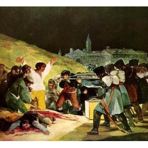 士兵背对观画者,医治的颜色与动作,彷佛庞大的国家机器,没有感情冷漠无情。穿白衣的人对面的灯,将其白衣照亮的充满光亮,他双手向上,宛如基督的受难,如果仔细看他的双掌,还会发现有细微的凹洞彷佛钉痕,充分显示哥雅是用著宗教感情在作画。
